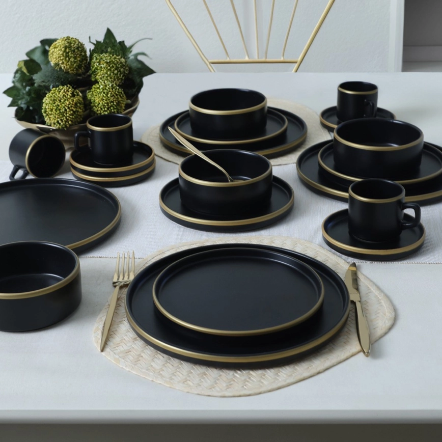 20-teiliges Tafelservice in Schwarz/Gold aus Steingut