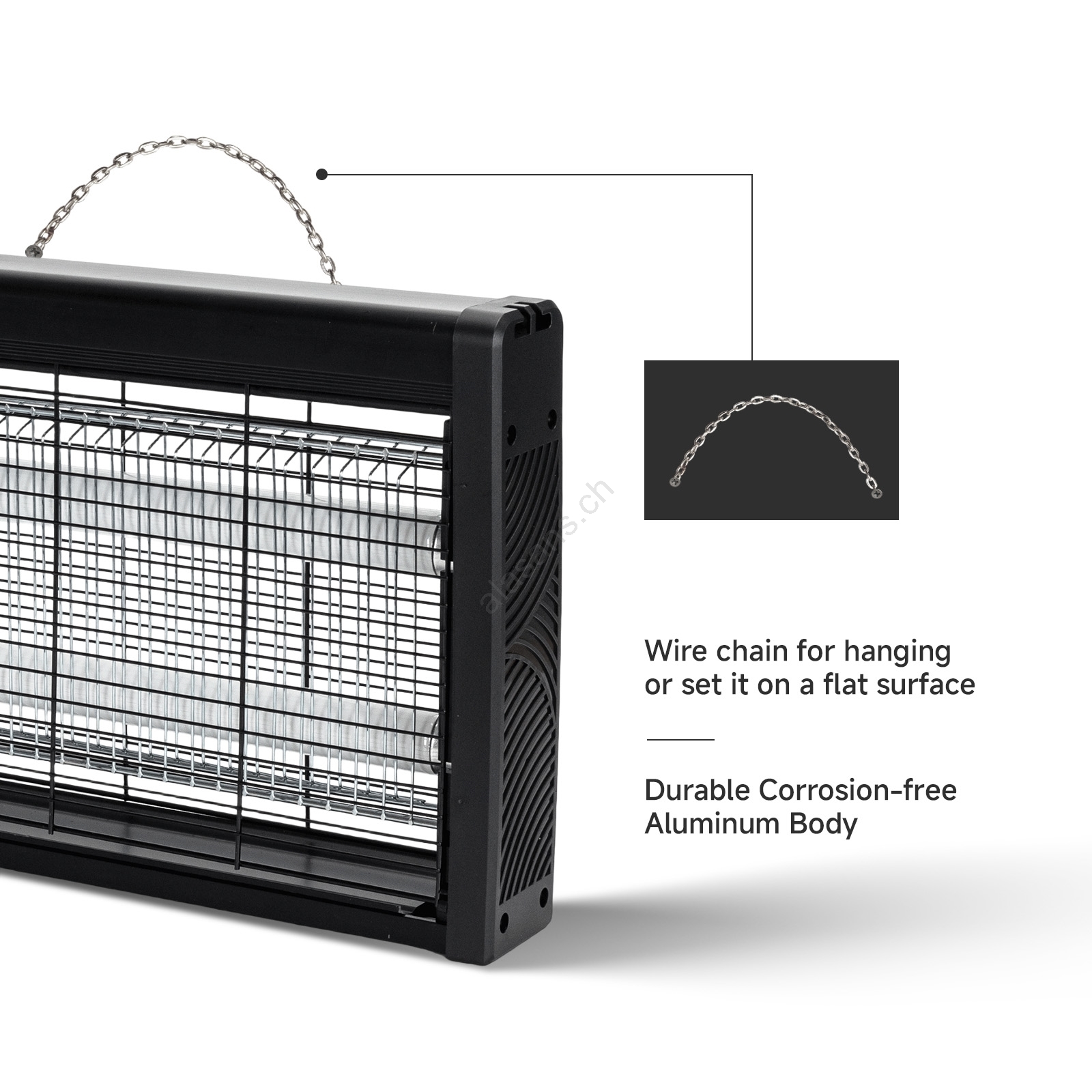 • Das Gerät kann gestellt oder aufgehängt werden (Kette im Lieferumfang enthalten).