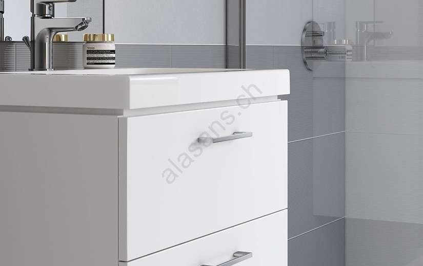 • Der Schrank verfügt über zwei geräumige Schubladen mit Soft-Close-Funktion und verchromten Griffen.