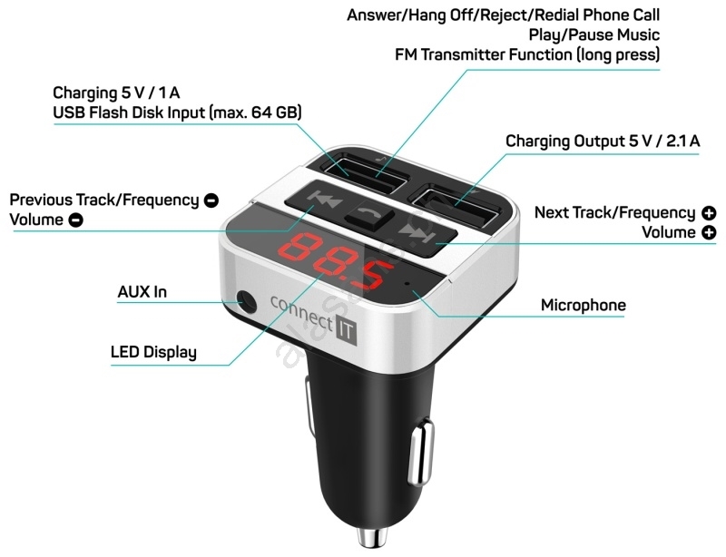 • FM-Transmitter, der drei Geräte in einem vereint – ein USB-Ladegerät mit zwei Anschlüssen, eine kabellose Bluetooth-Freisprecheinrichtung und einen Musikplayer.