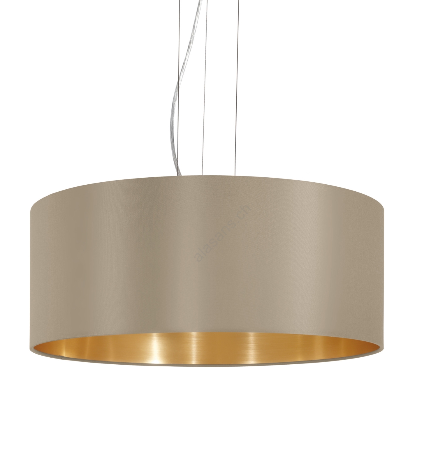 • Das Erscheinungsbild der Leuchte wird durch einen Lampenschirm aus Textil in außen grau-beiger und innen goldener Farbe unterstrichen, ergänzt durch einen Metallpendel.