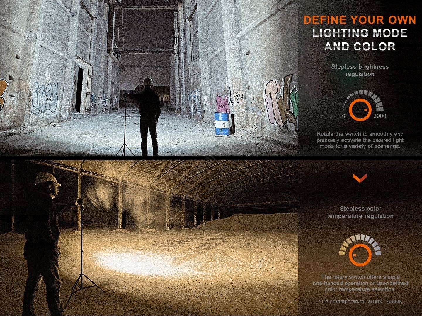 • Weißes Licht mit stufenlos einstellbarer Leistung: 2000 – 10 Lumen (mit einer Lebensdauer von 9 – 360 Stunden).