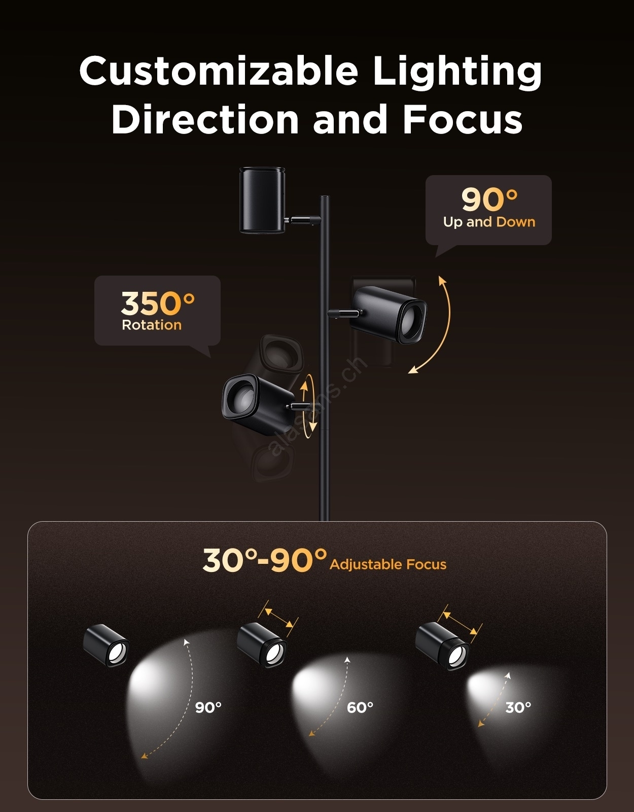 • Les bras pivotent : horizontalement jusqu'à 350°, verticalement jusqu'à 90°, les têtes de lampe peuvent s'incliner de 30° à 90°.