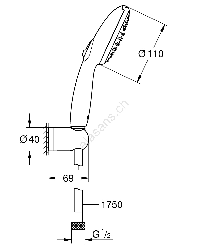 • Support mural de douche Vitalio Universal, non réglable, pouvant être fixé par vissage (vis et chevilles incluses) ou par collage (adhésif GROHE QuickGlue S 41 247 000 vendu séparément).