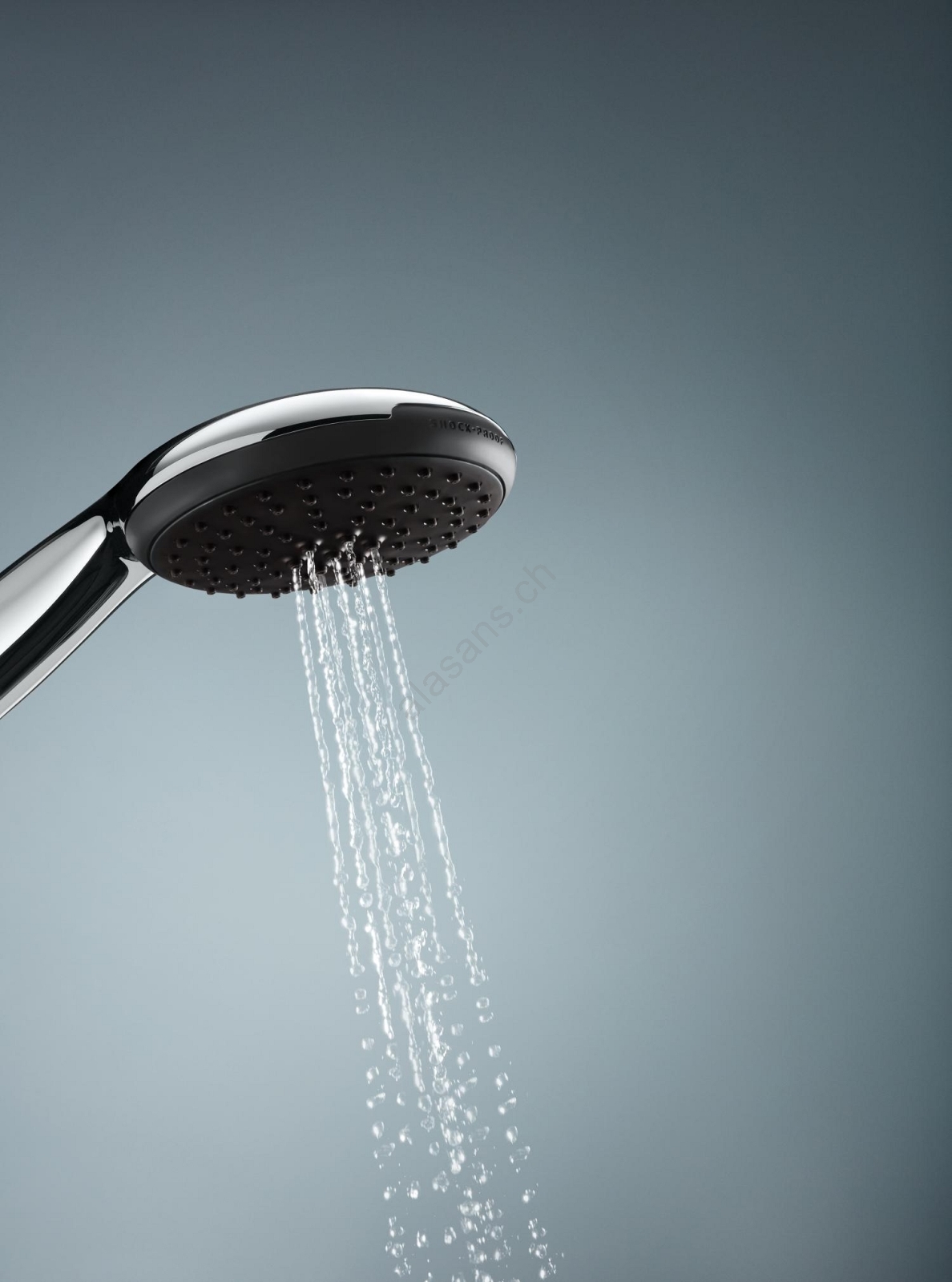 • Pommeau de douche à main Vitalio Start 110 de 110 mm de diamètre avec deux modes de jet : le Rain apaisant et le Jet intensif.