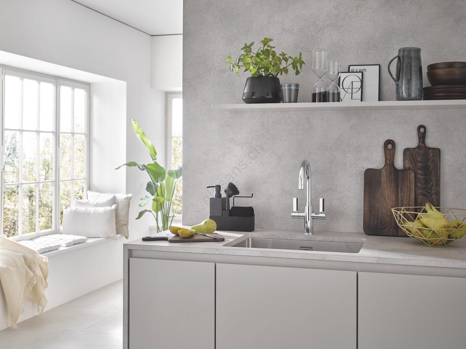 • Évier de cuisine en acier inoxydable GROHE K700U alliant design moderne et longue durée de vie.