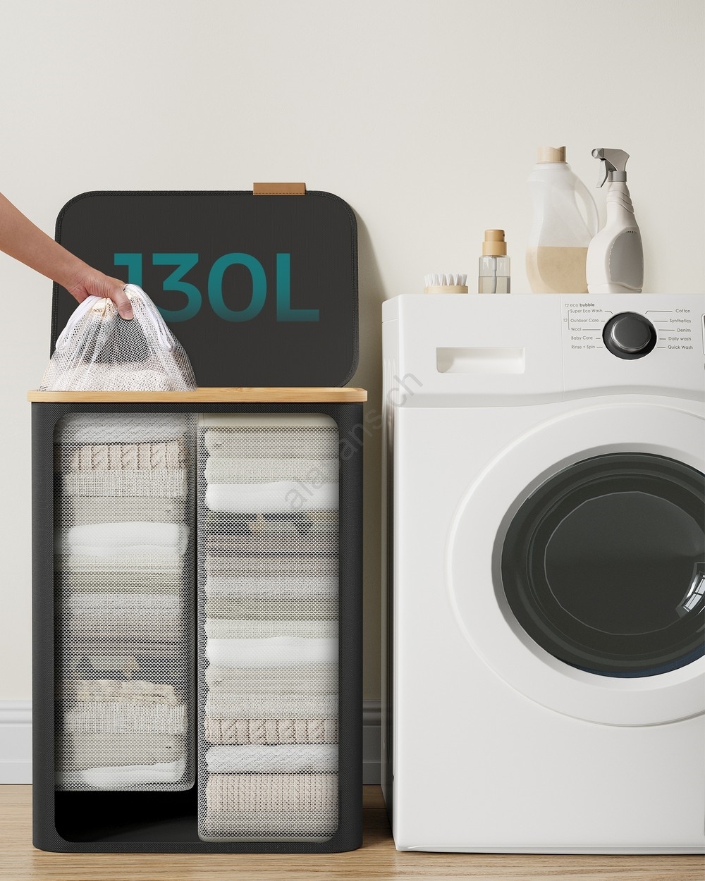 • Le panier a une grande capacité 130 l pour vos vêtements, serviettes et linge de lit et 2 compartiments vous permettent de trier le tout par couleur.