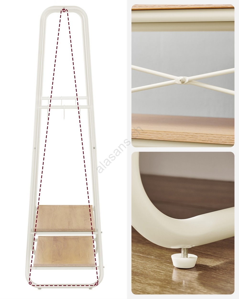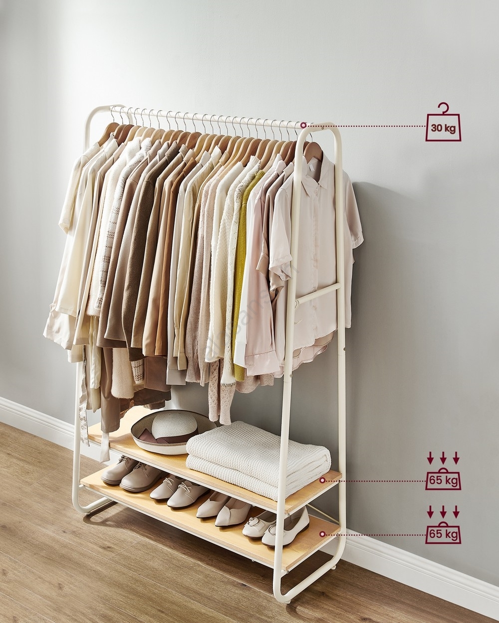 • Accrochez vestes, chemises et pantalons sur la barre supérieure sur toute sa longueur, rangez sacs, chaussures ou boîtes sur 2 étagères de rangement, et suspendez chapeaux, écharpes et parapluies sur les côtés.