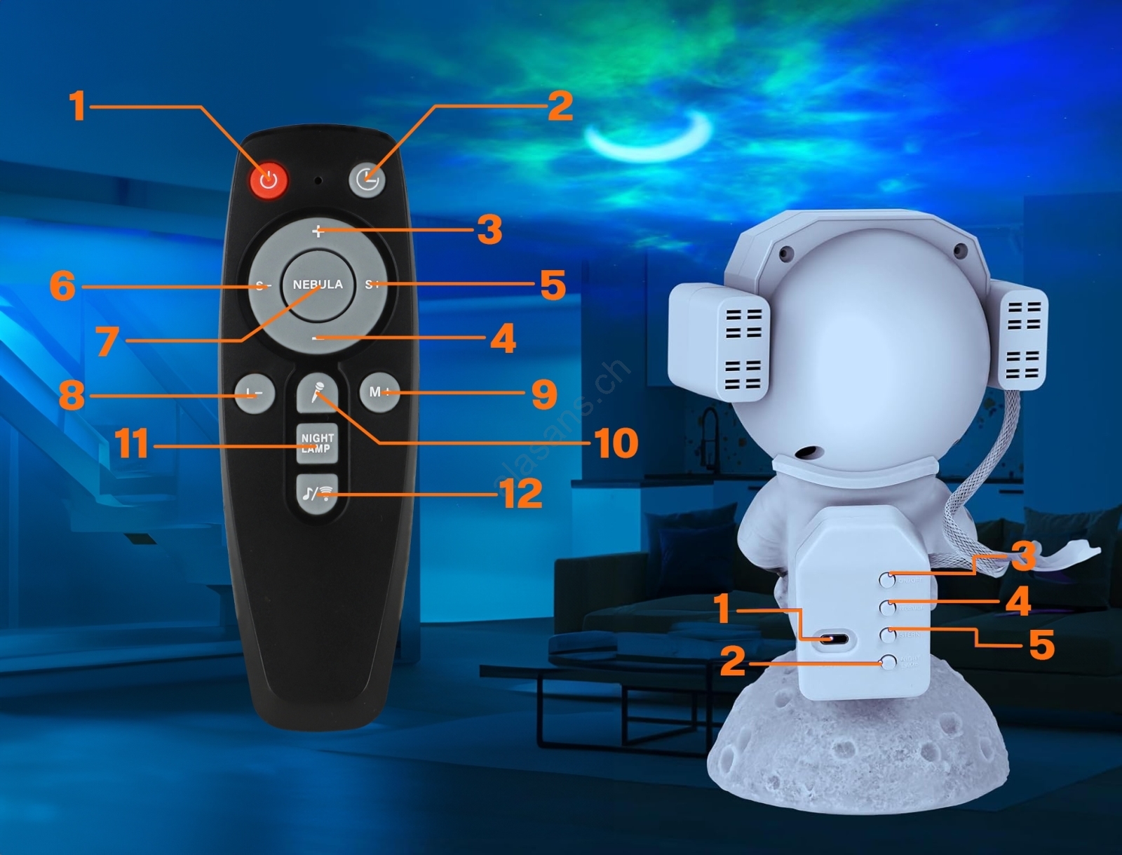 Projecteur LED RGB 3 en 1, 5W/5V, 3000/4000/6000K, au design astronaute + télécommande