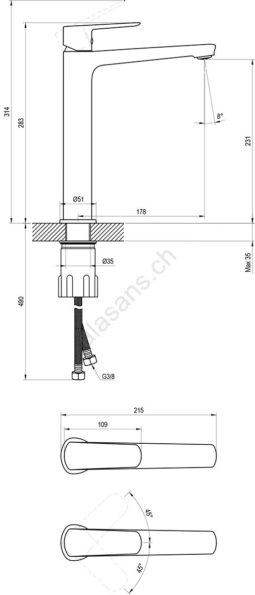 • Le mitigeur est livré sans bonde et comprend des flexibles de raccordement de 450 mm de longueur, de diamètre G3/8.