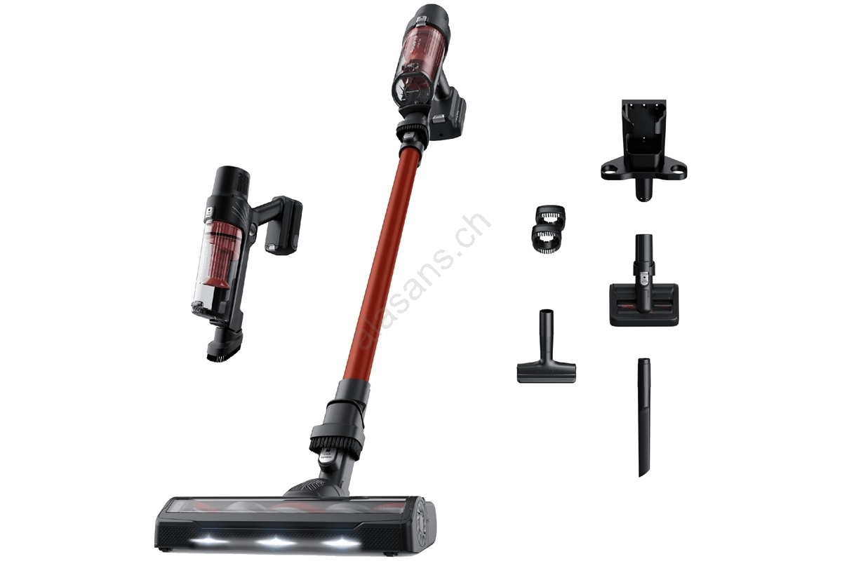 • Accessoires : brosse pour tissus d'ameublement, buse pour fentes, support mural, kit spécial pour poils d'animaux, tête avec brosse motorisée et éclairage LED.