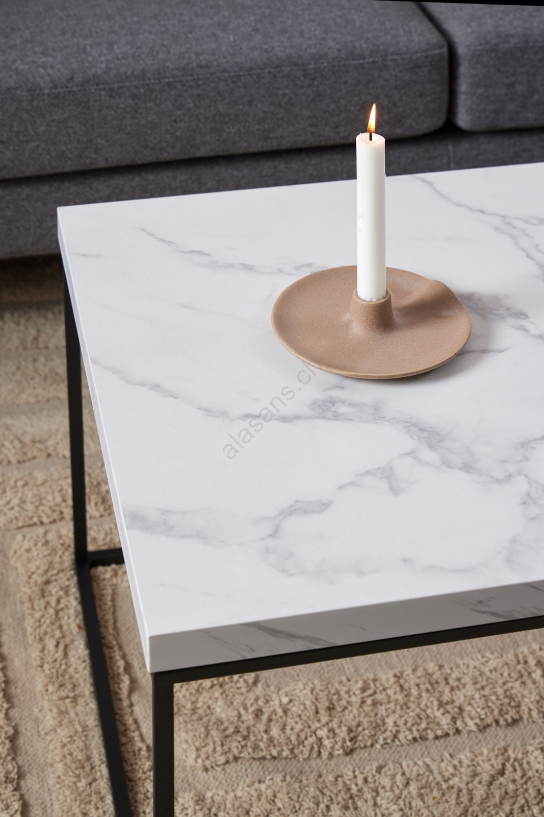 • Plateau en marbre blanc de Carrare recouvert d'un mélaminé à texture brute, piètement en acier peint par poudrage noir mat à finition rugueuse.