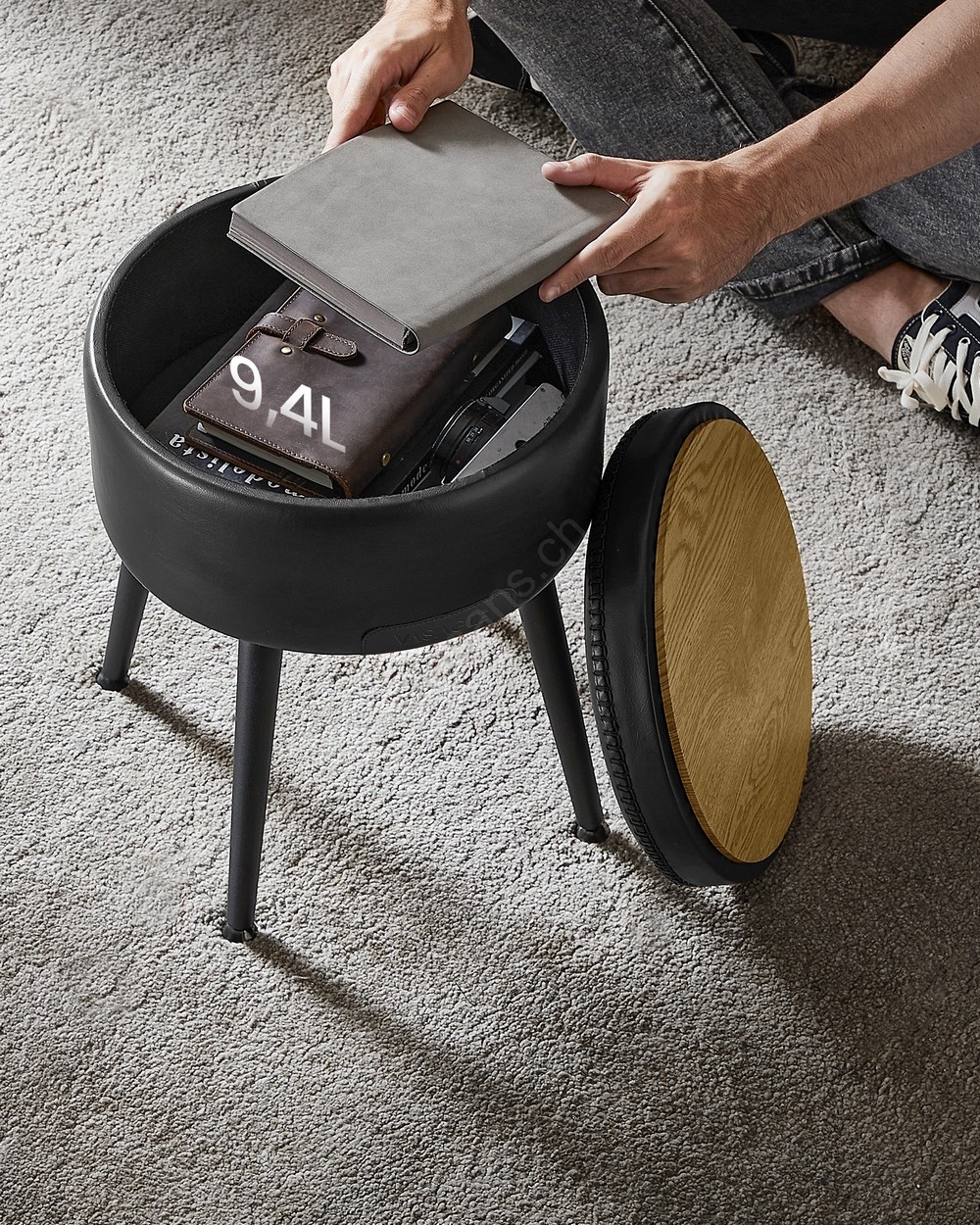 • À l'intérieur du tabouret se trouve un espace (9,4 l) pour dissimuler appareils électroniques, livres, plaids et autres petits objets.