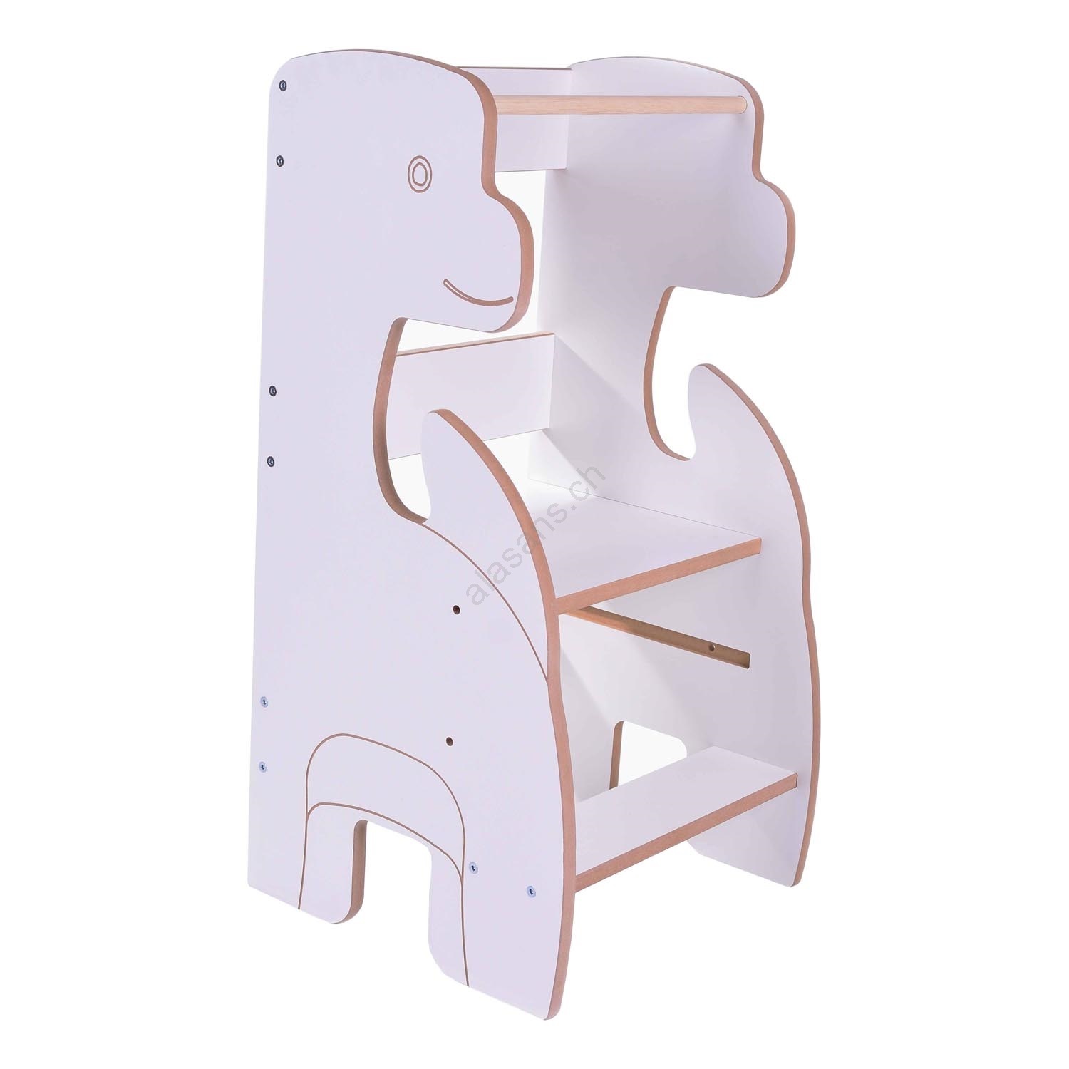 • La tour se compose d’une plateforme sur laquelle l’enfant se tient debout, d’une marche pour y accéder, et d’une barrière de sécurité tout autour.