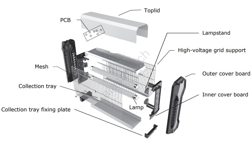 • Protection IP20 - lors d'une utilisation à l'extérieur (balcon, terrasse, pergola), il est recommandé de placer l'attrape-insectes dans un endroit sec, à l'abri de l'eau ou d'une humidité excessive.