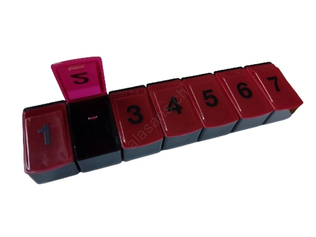 • L'organiseur se compose de sept compartiments numérotés (un par jour), placés dans un boîtier principal.