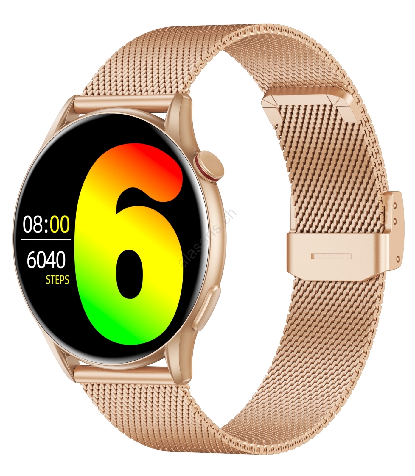 • Le kit comprend : SmartWatch WG AirFlex Elegance, bracelet doré, kit de réglage du bracelet, bracelet en silicone rose, câble de charge dédié.