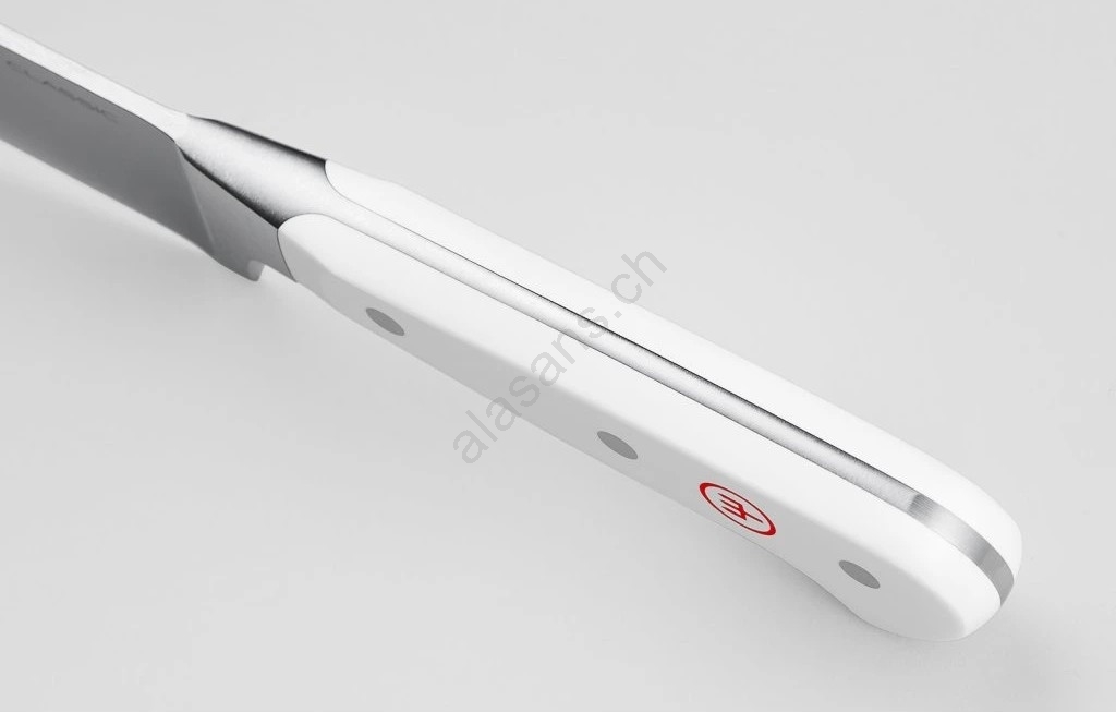 • Le manche est en POM (matière synthétique), de couleur blanche résistante à la décoloration et fixé par trois rivets en acier inoxydable.