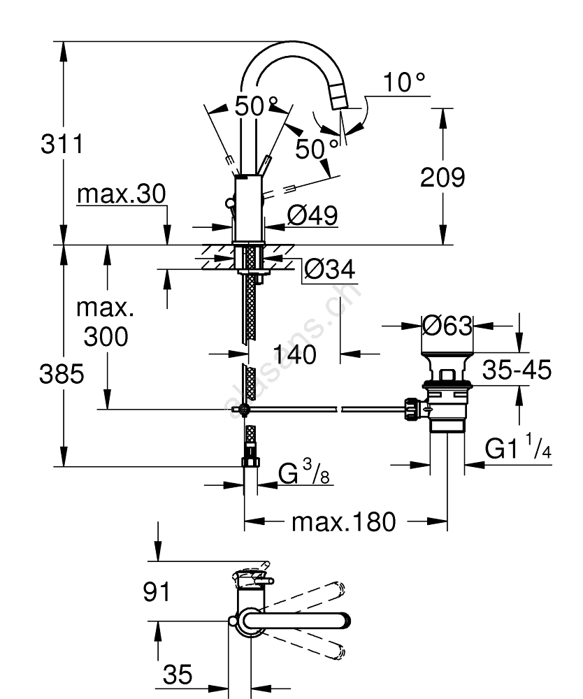 • Ablaufgarnitur 1 1/4" ermöglicht bequeme Bedienung des Abflusses direkt an der Armatur.