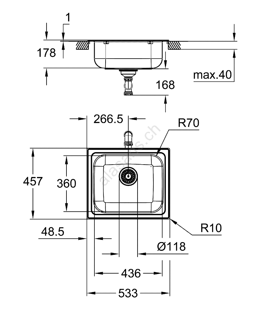 • Innenradius des Beckens R70 erleichtert die Reinigung.