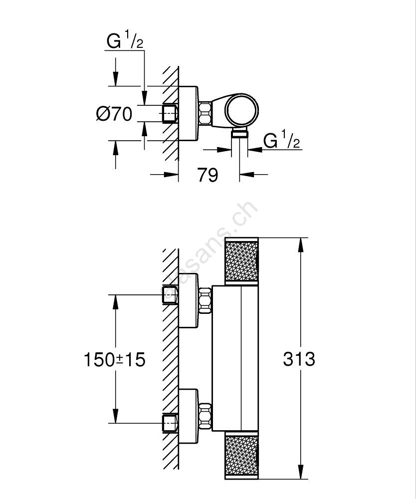 • Wandmontierte thermostatische Duscharmatur mit elegantem, schlankem Design.