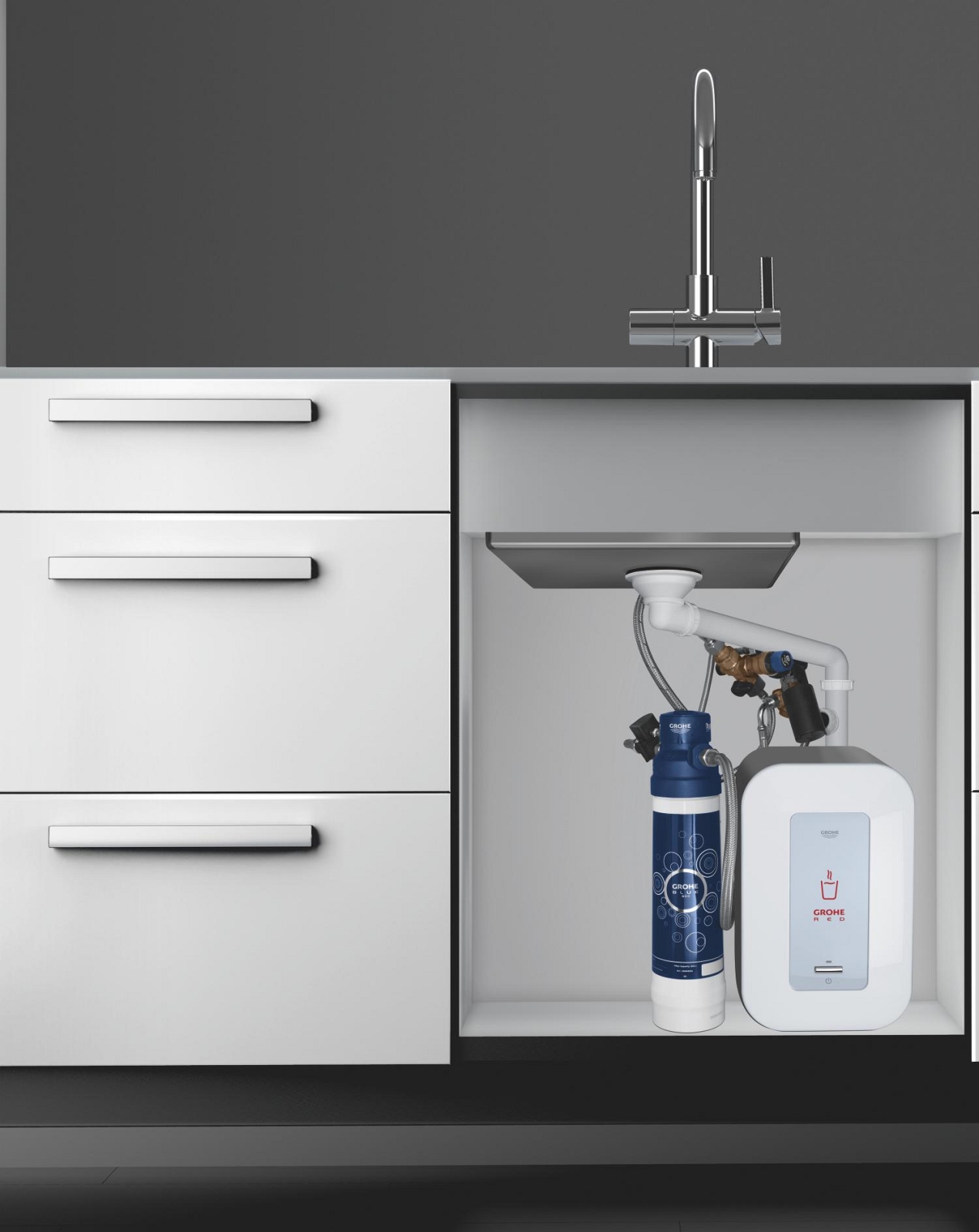 • Das Starter-Set GROHE Blue S-Size bietet klares und geschmackvolles Trinkwasser – ideal für Gebiete mit hartem Wasser über 12 °dH.