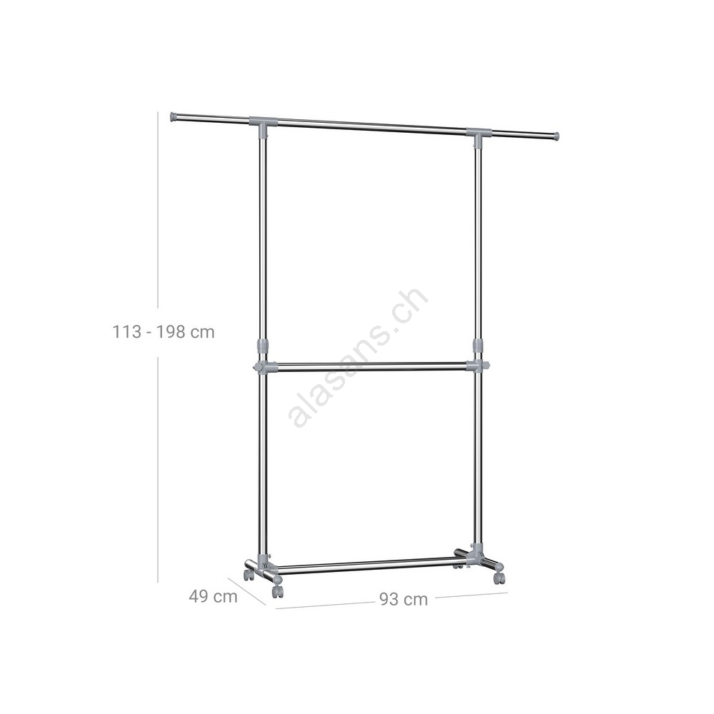 • L'altezza è regolabile da 113 cm a 198 cm e la lunghezza da 101 cm a 166 cm, permettendoti di adattarlo a diversi ambienti e a capi di varie lunghezze.