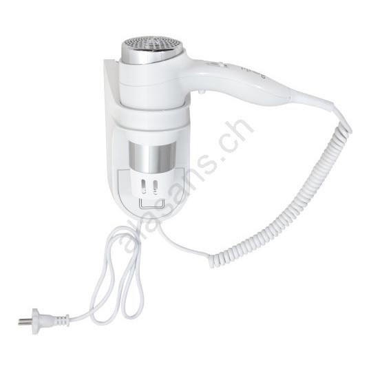 • Elegante asciugacapelli bianco con supporto da parete per risparmiare spazio.