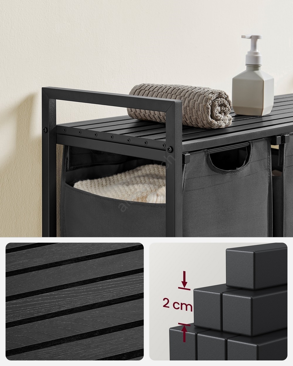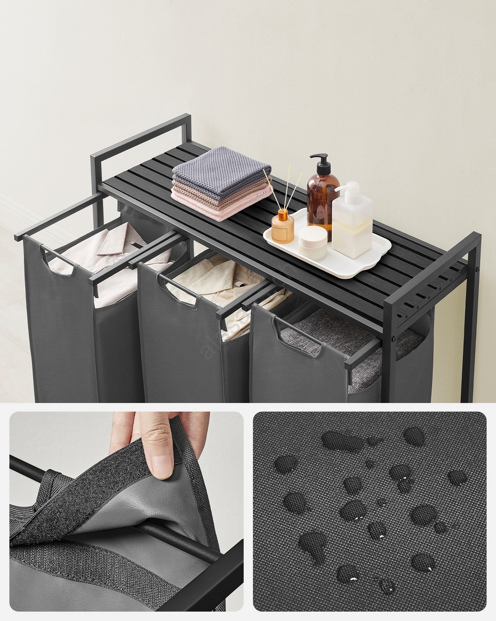• 3 sacchi, 1 ripiano – Suddividi il bucato in tre sacchi in tessuto (38 l per sacco) e riponi detersivi, ammorbidente e altri prodotti sul ripiano.
