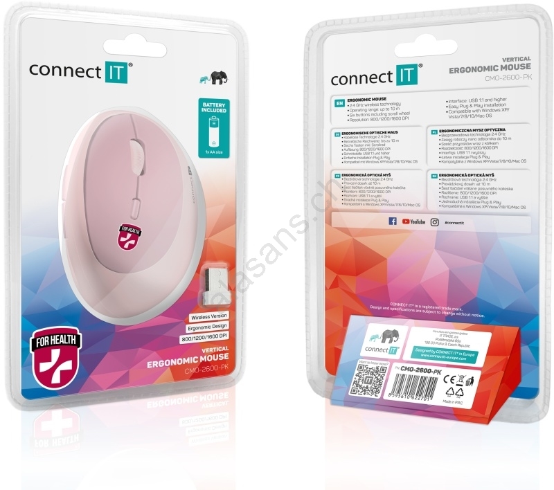 CONNECT IT CMO-2600-PK - Mouse ergonomico senza fili 800/1200/1600 DPI selezionabili 1xAA rosa