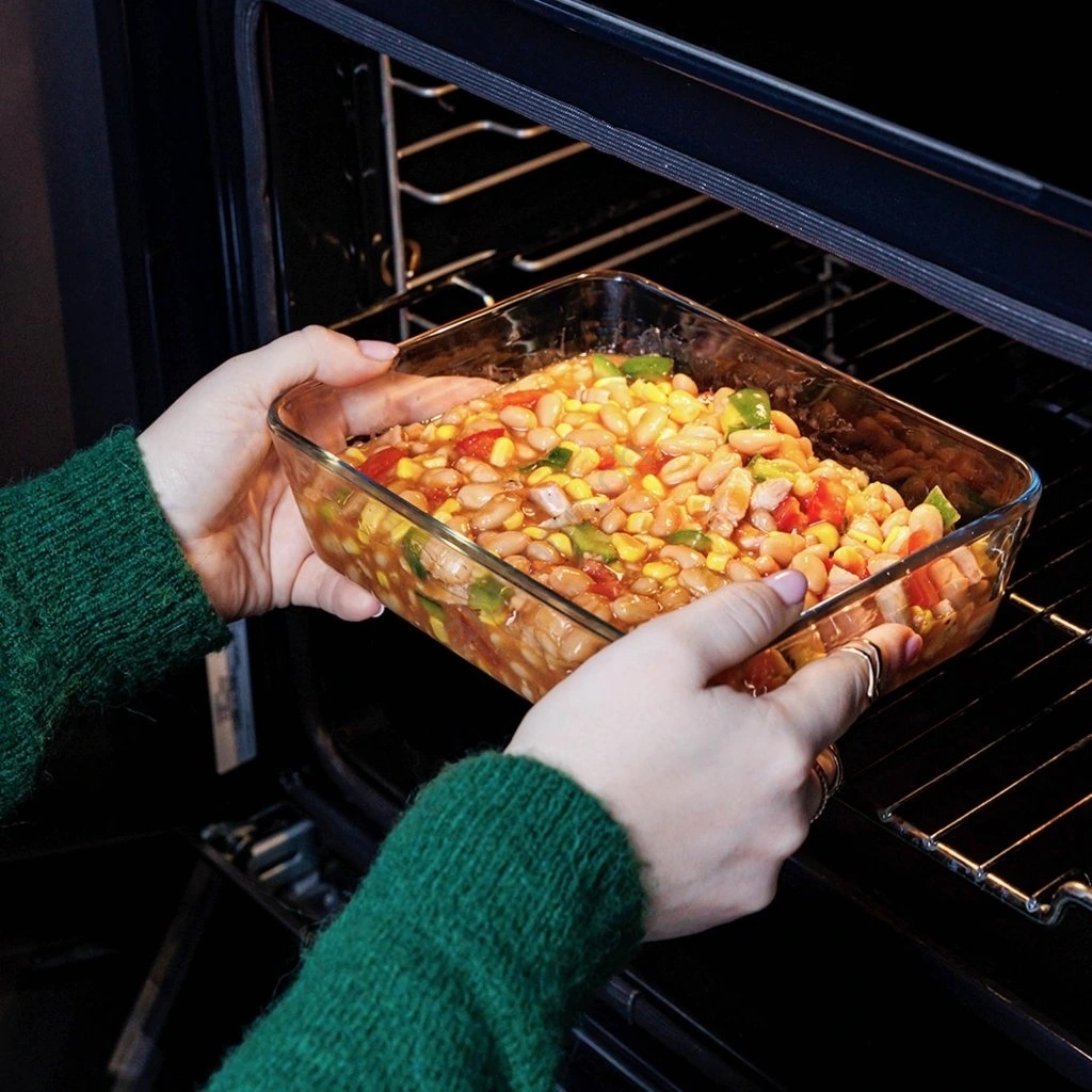 • La forma rettangolare ottimizza lo spazio in forno e in frigorifero e il coperchio garantisce una conservazione più prolungata degli alimenti.