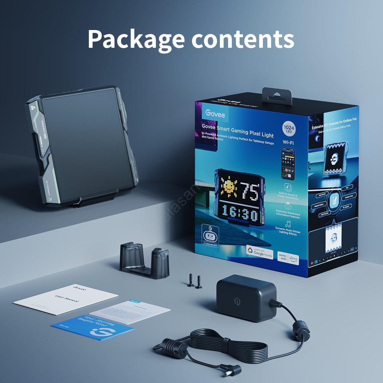 • Contenuto della confezione: 1× pannello pixel, 1× supporto, 1× staffa da parete, 1× adattatore di alimentazione, materiale di collegamento.
