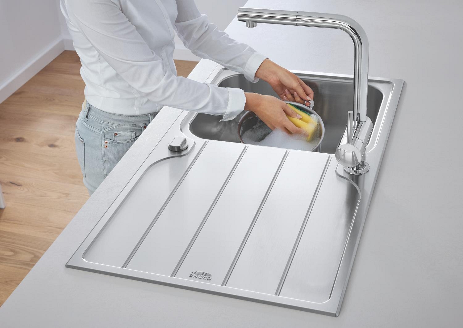 • La tecnologia GROHE Whisper riduce il rumore durante lo scarico dell'acqua per un funzionamento più silenzioso in cucina.
