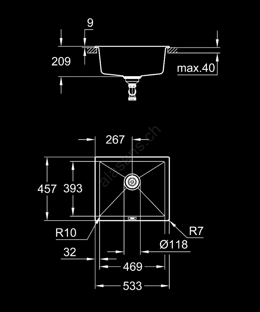 • Raggio esterno: R7; raggio interno della vasca: R10 per un design elegante.