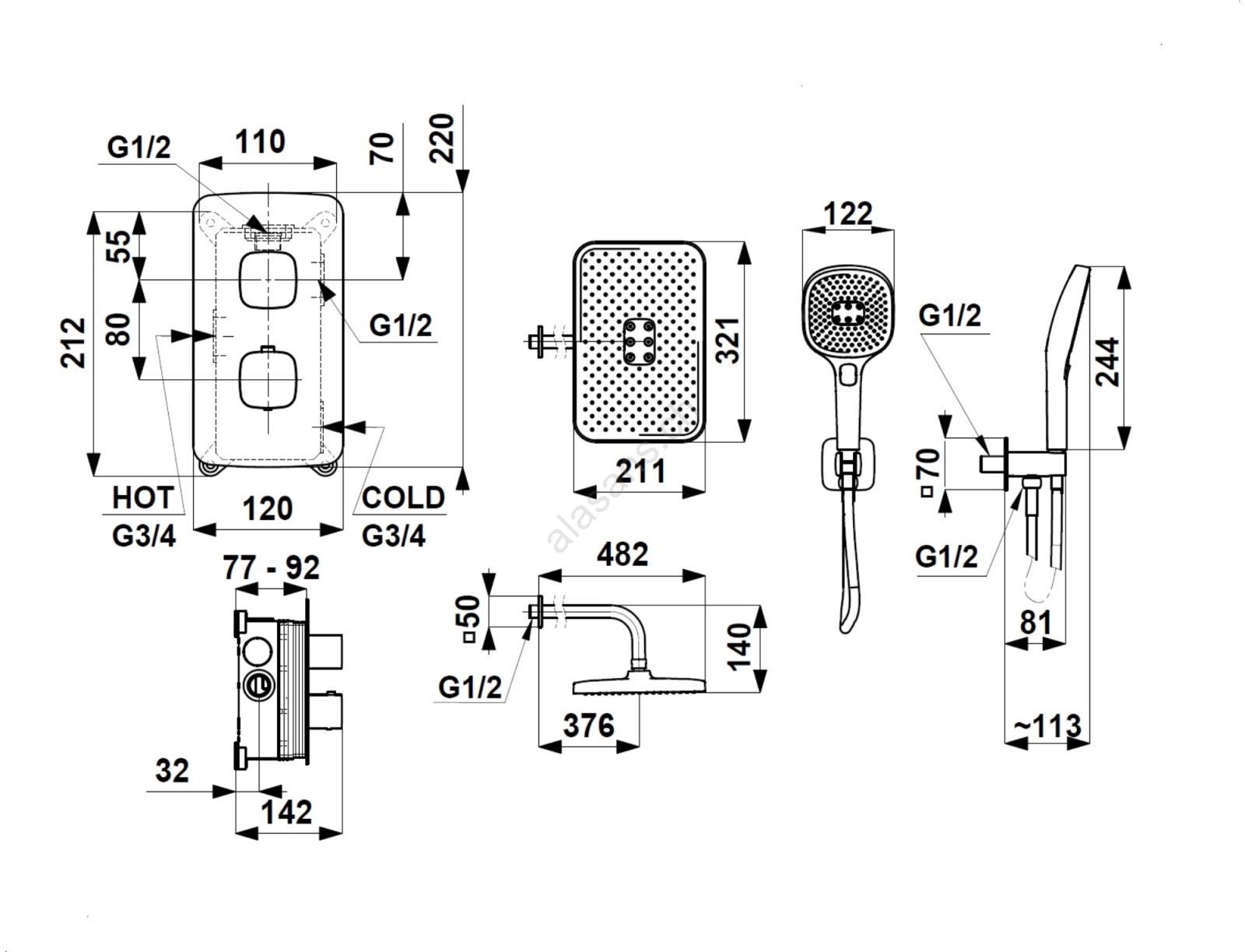 • Contenuto della confezione: scatola da incasso, miscelatore completo, braccio, soffione doccia con flessibile, raccordo angolare da incasso per parete.