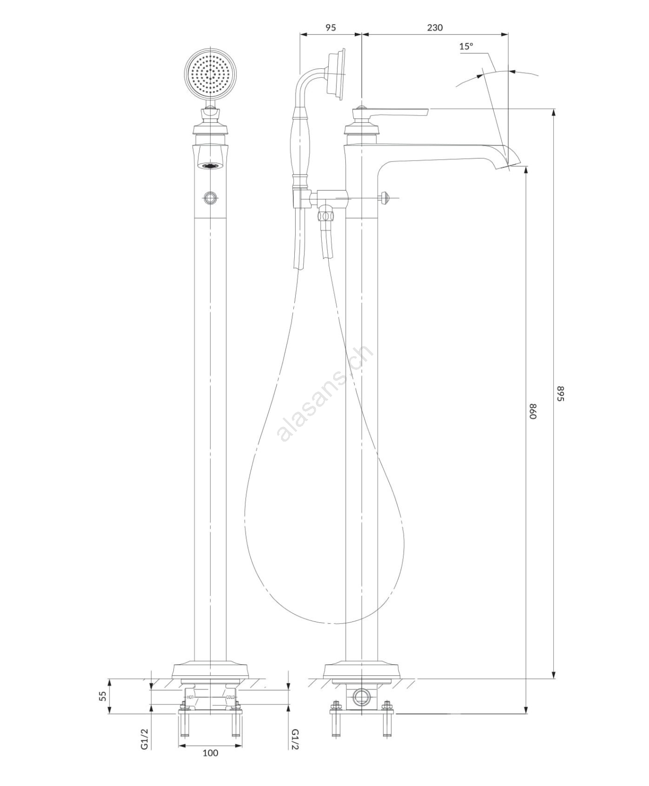 • Set comprende: rubinetto in ottone, doccetta in ottone (1 funzione), tubo doccia in ottone (150 cm), supporto in ottone per doccetta con inserto protettivo.