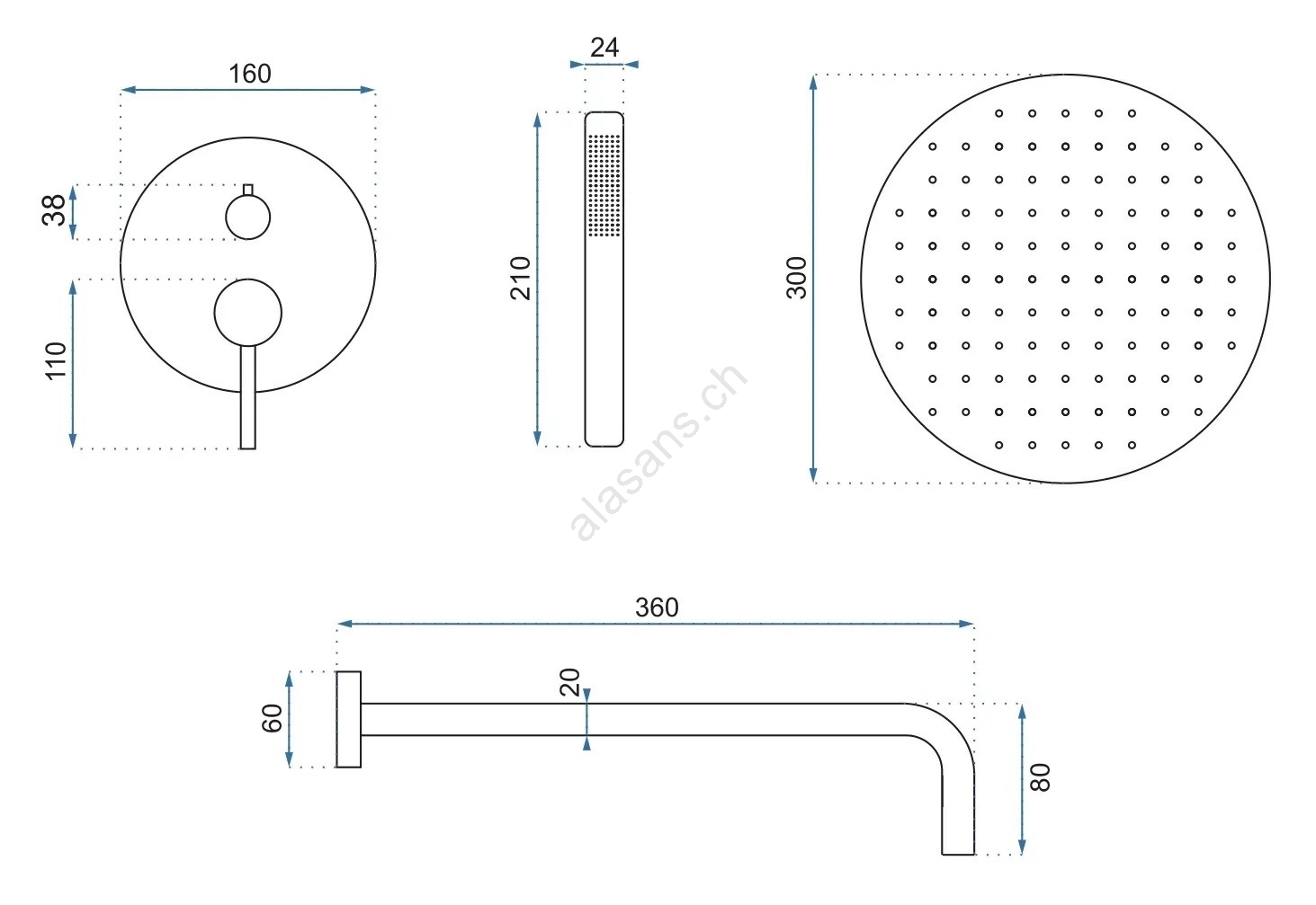 • La confezione comprende: scatola da incasso, miscelatore completo, braccio, doccetta e soffione, supporto per doccetta, flessibile da 150 cm.