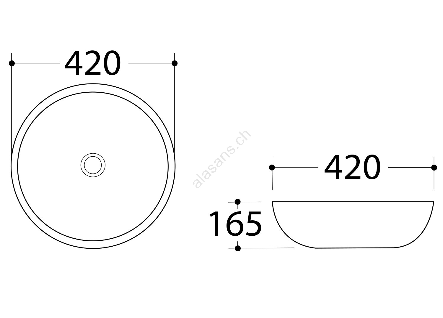• Il lavabo in ceramica da appoggio ha un diametro di 420 mm.