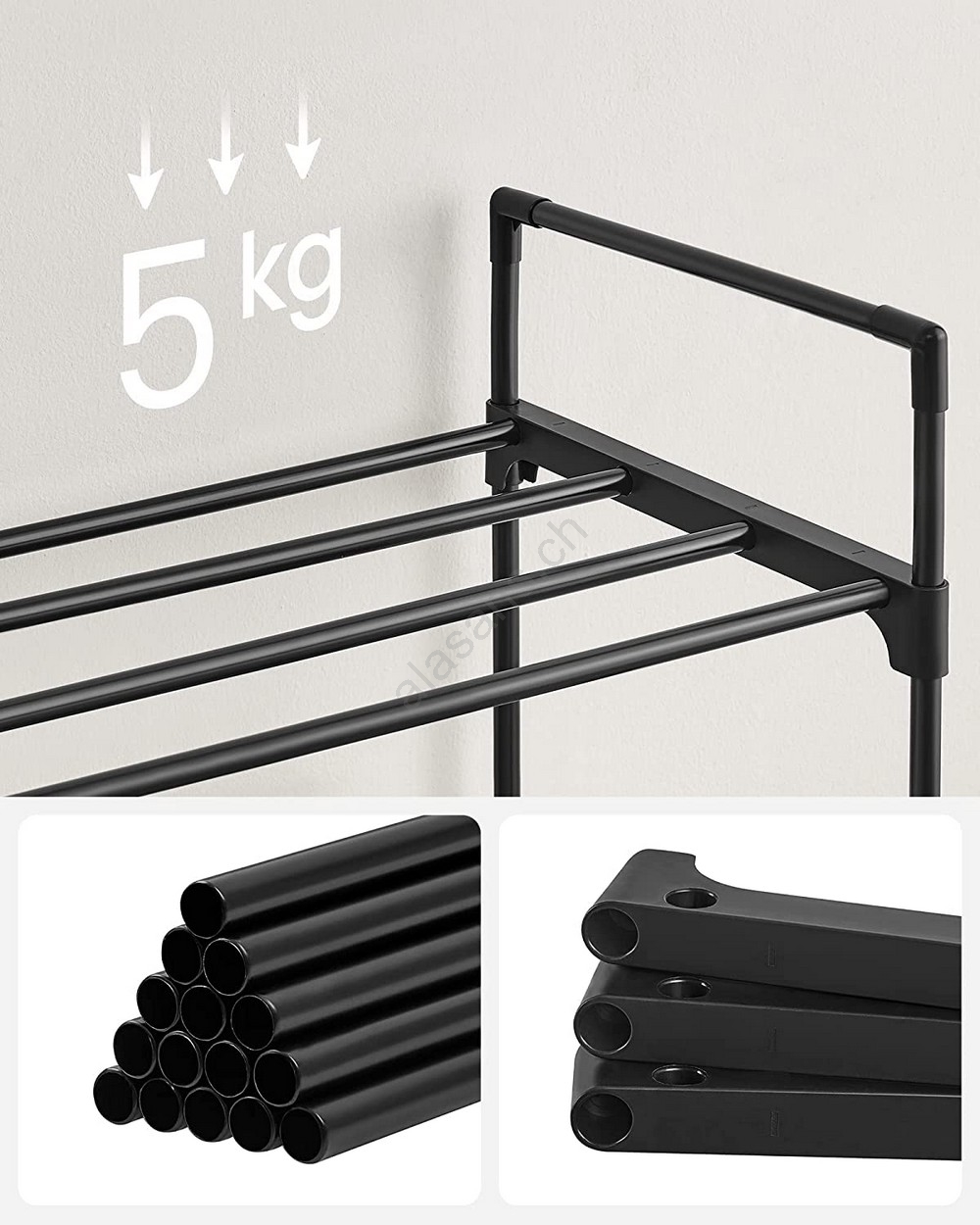 • Ogni ripiano sostiene fino a 5 kg, assicurando un supporto solido per le tue scarpe.