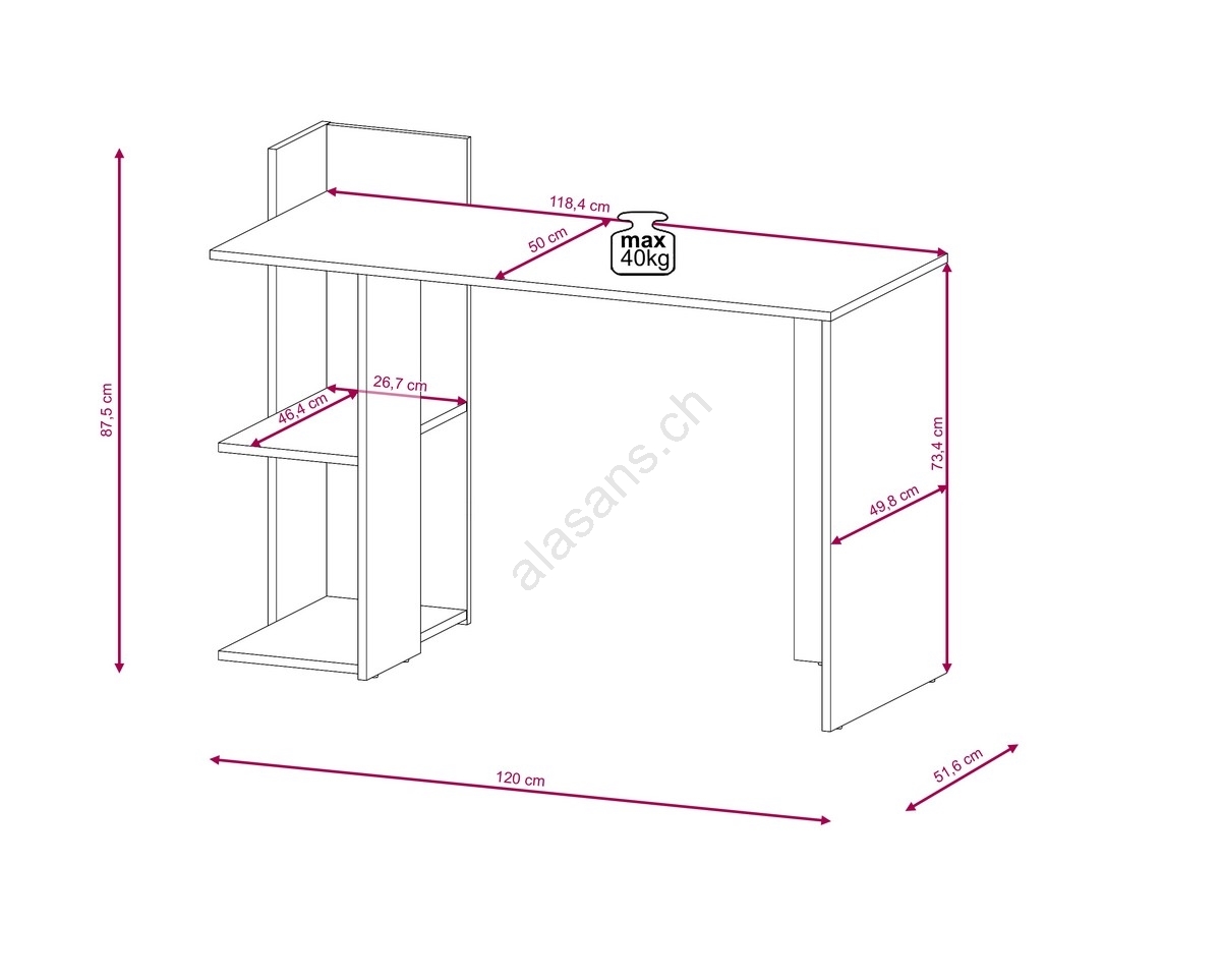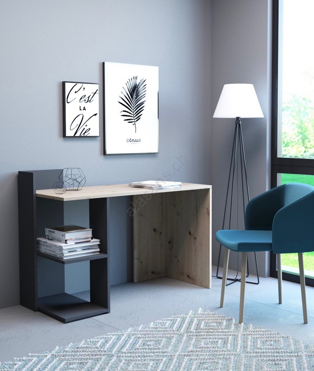 • Il piano di lavoro rettangolare è sostenuto da uno scaffale laterale con due ripiani aperti, ideali per riporre libri, accessori per l'ufficio o oggetti decorativi.