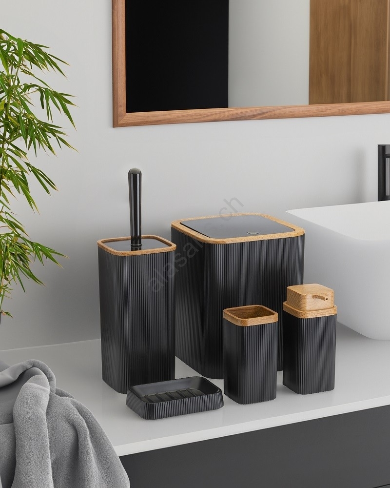 • Il set comprende: dispenser per sapone, portasapone, bicchiere per spazzolino e dentifricio, cestino per rifiuti e scopino per WC.