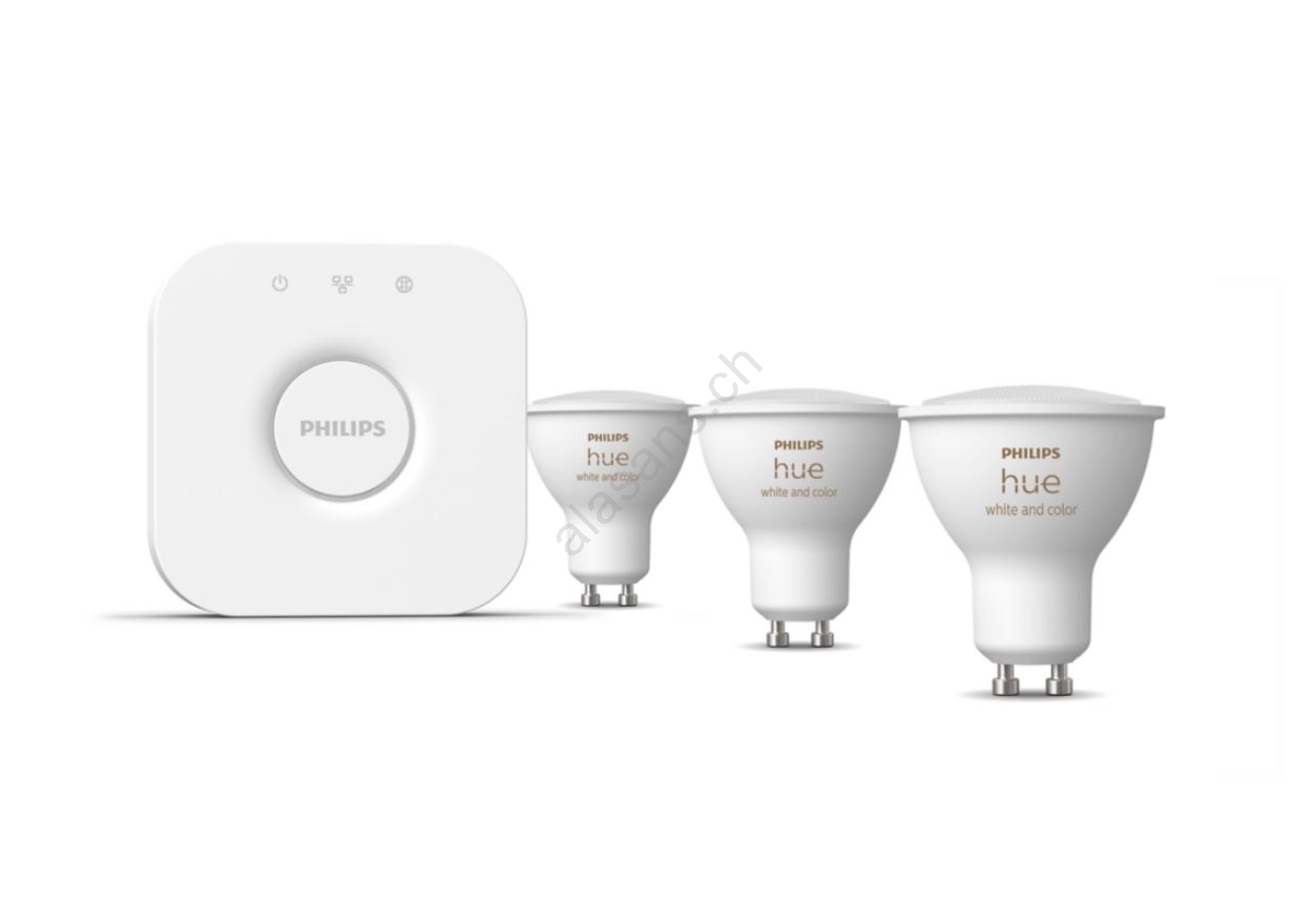 • Il set include il dispositivo di collegamento Hue Bridge e 3 lampadine LED RGB Philips Hue White And Color Ambience con attacco GU10.