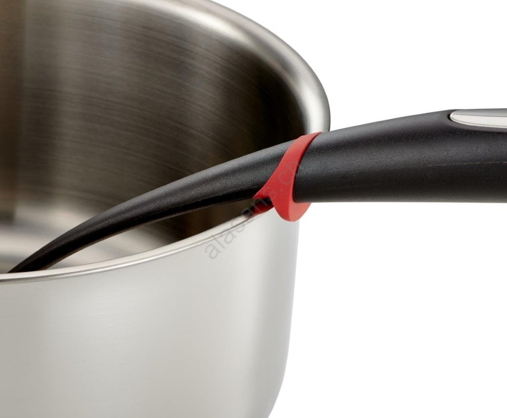 • Sul manico è presente un anello in silicone rosso che permette di appoggiare il mestolo anche sul bordo di padelle o pentole calde.