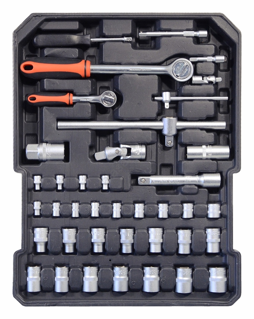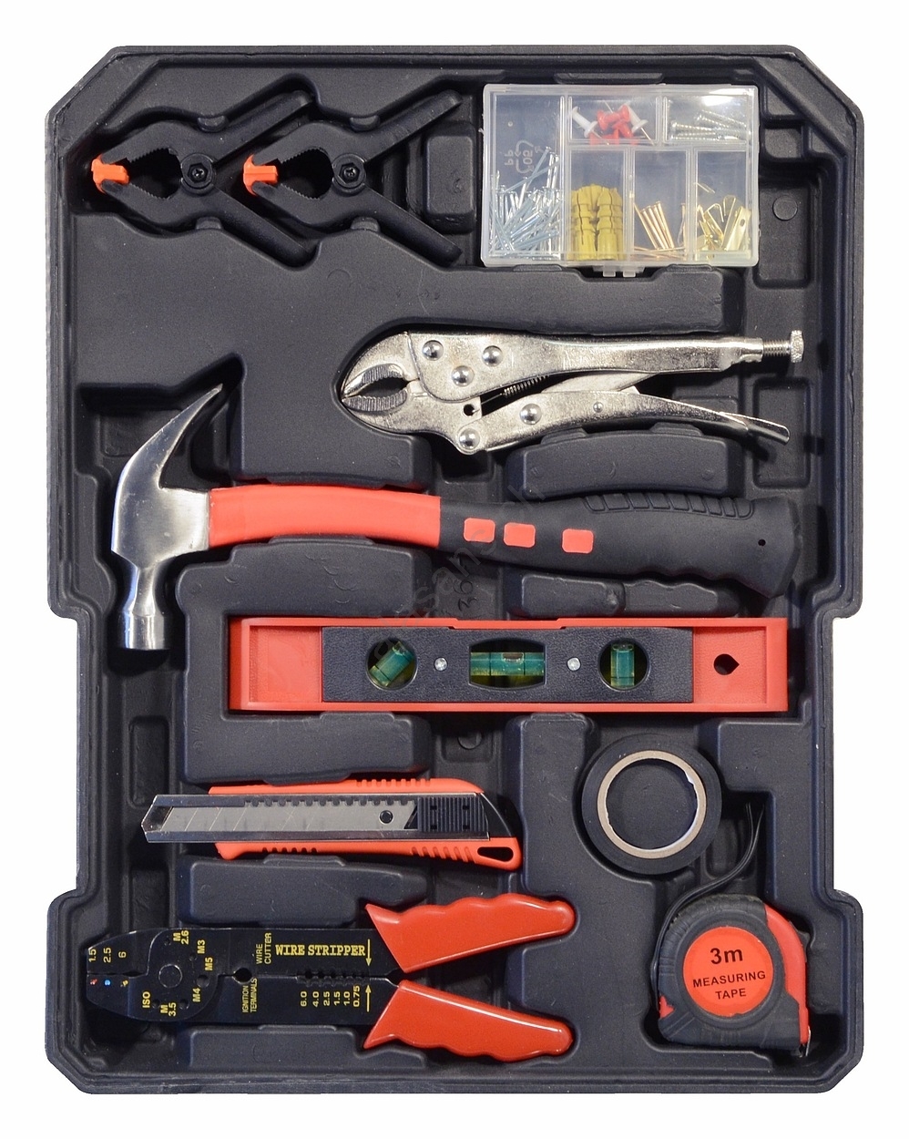 • Il set comprende pinze, cacciaviti, chiavi a bussola, martello, livella, chiavi laterali e a brugola, punte, elementi di fissaggio di base e una varietà di altri strumenti.