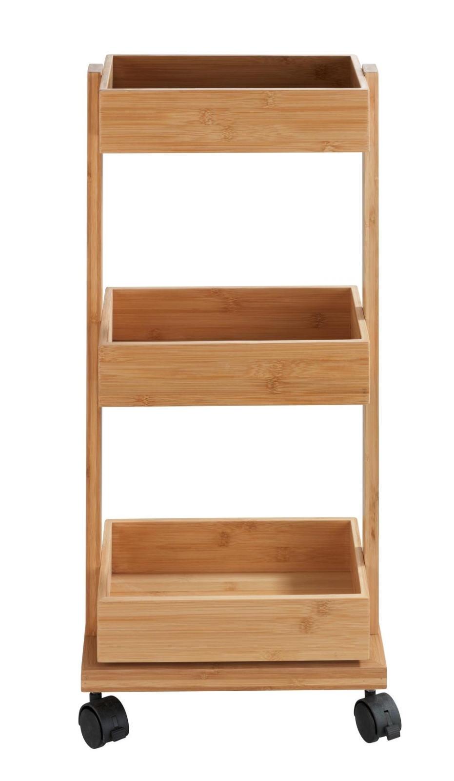 • Elegante scaffale contenitore su ruote in bambù naturale.