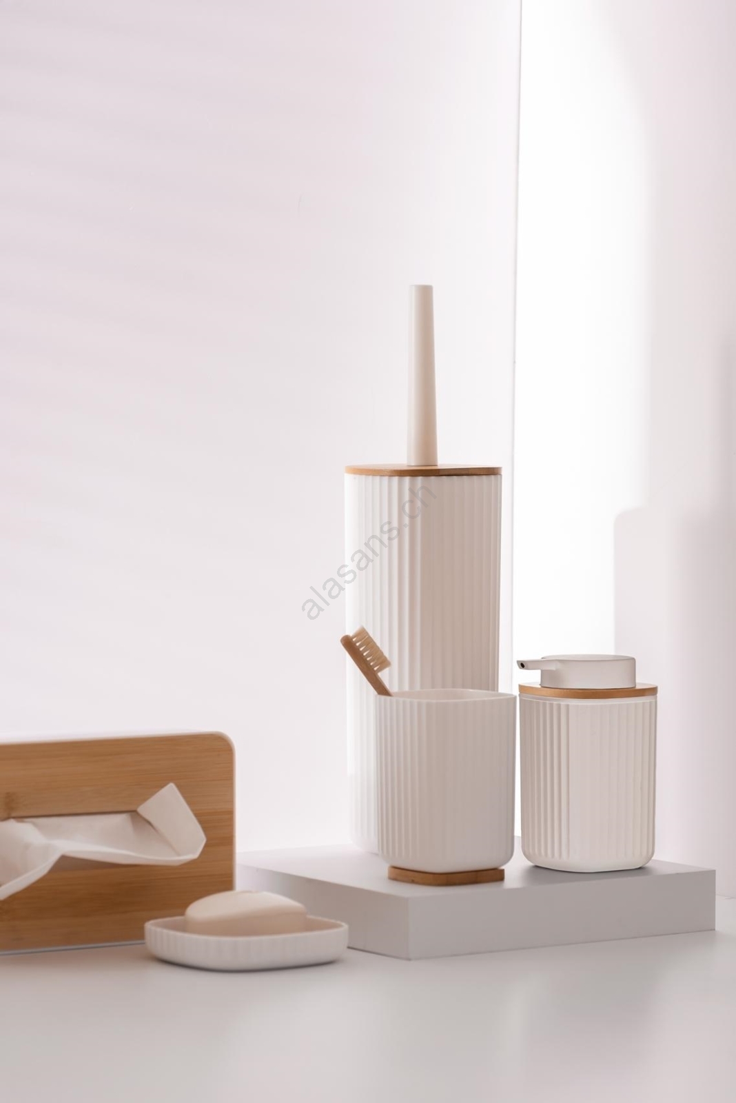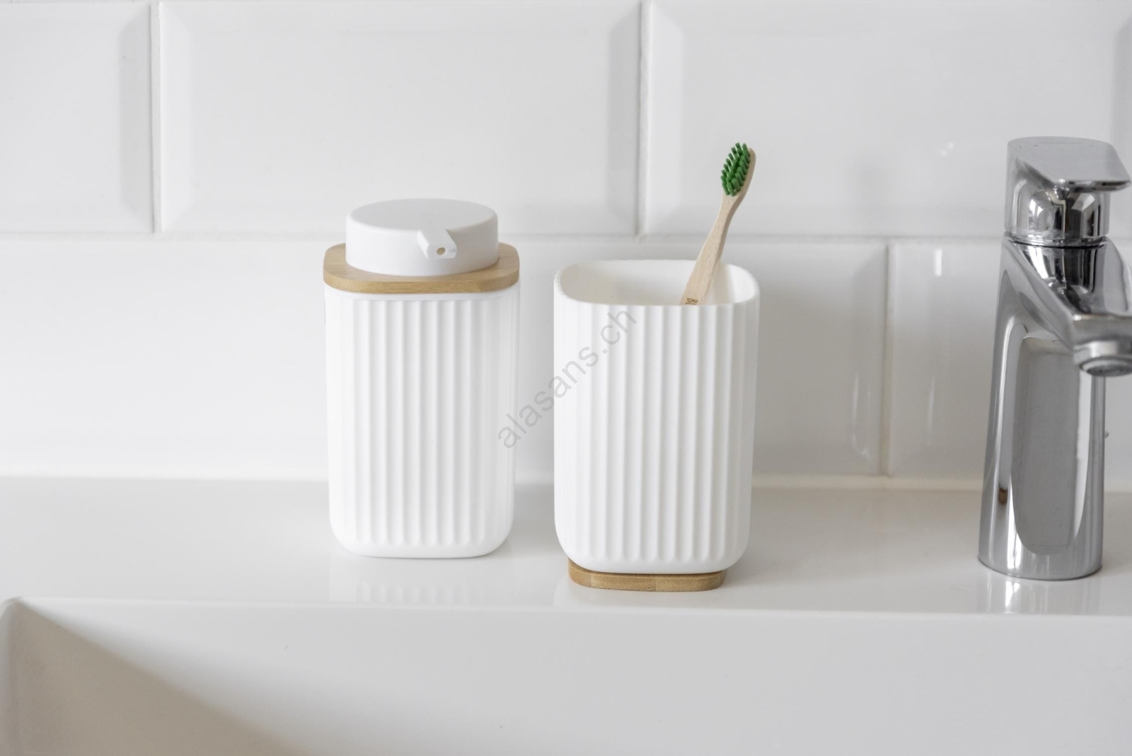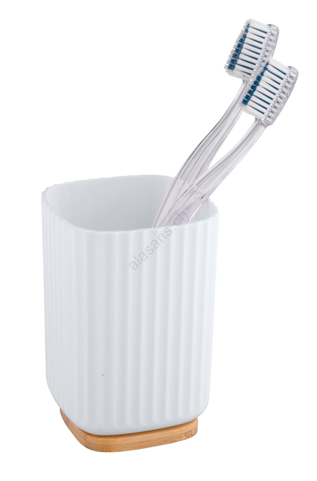 • Elegante bicchiere porta spazzolini dal design moderno, bianco con base in bambù.