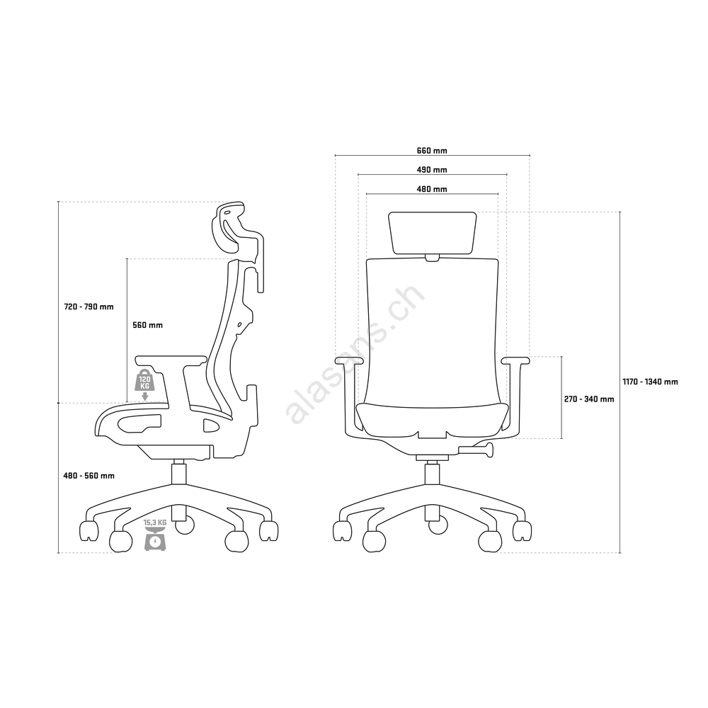 • La sedia è certificata per una portata fino a 120 kg ed è adatta a utenti di altezza compresa tra 150 e 200 cm.