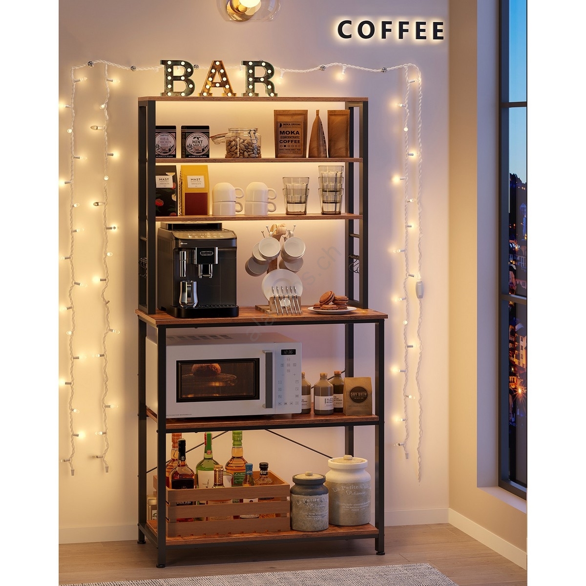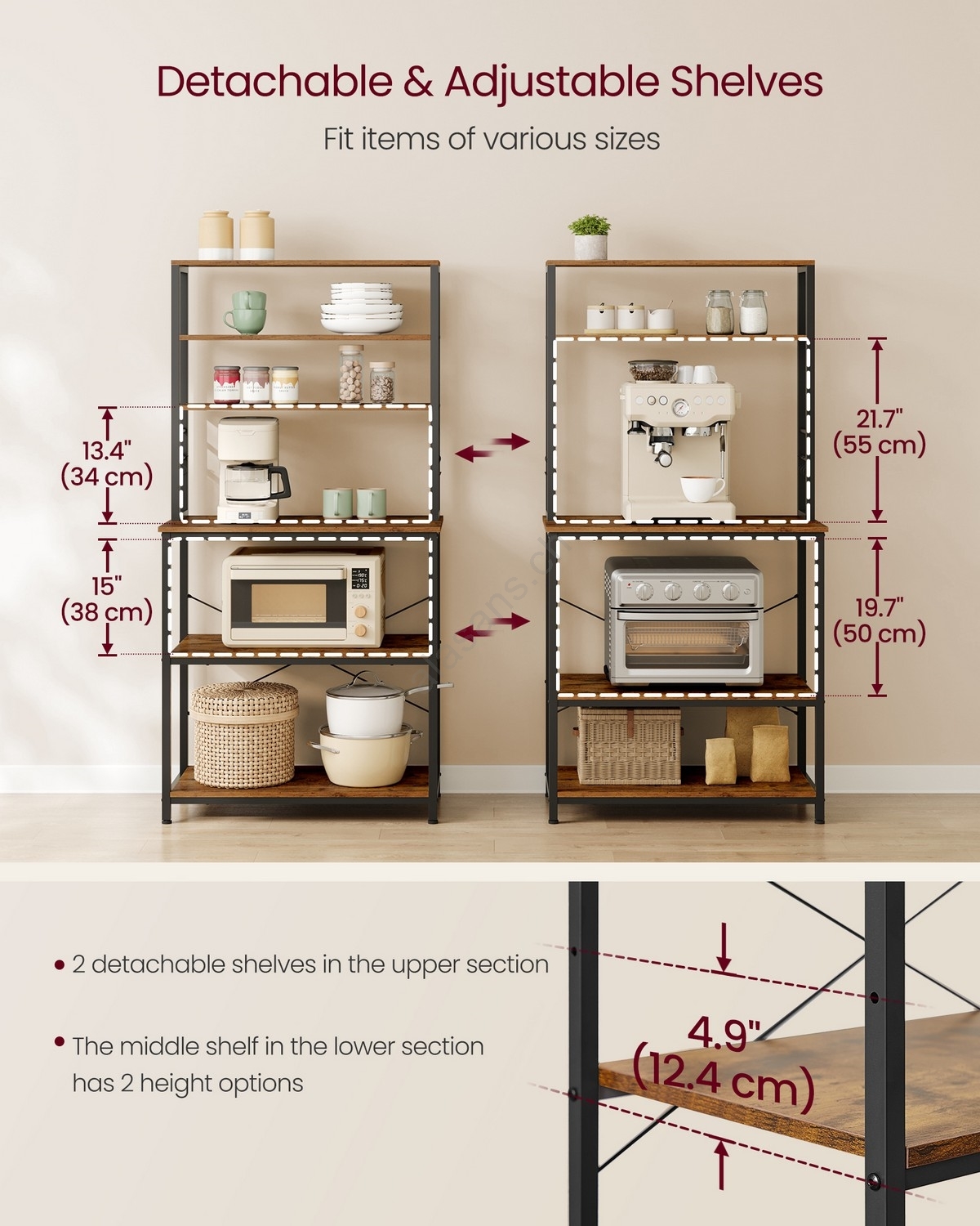 • Das untere mittlere Fach lässt sich in 2 Höhen verstellen, so dass Sie Geräte verschiedener Größen darauf platzieren können – vom Mixer über die Heißluftfritteuse bis hin zu Töpfen und Pfannen.