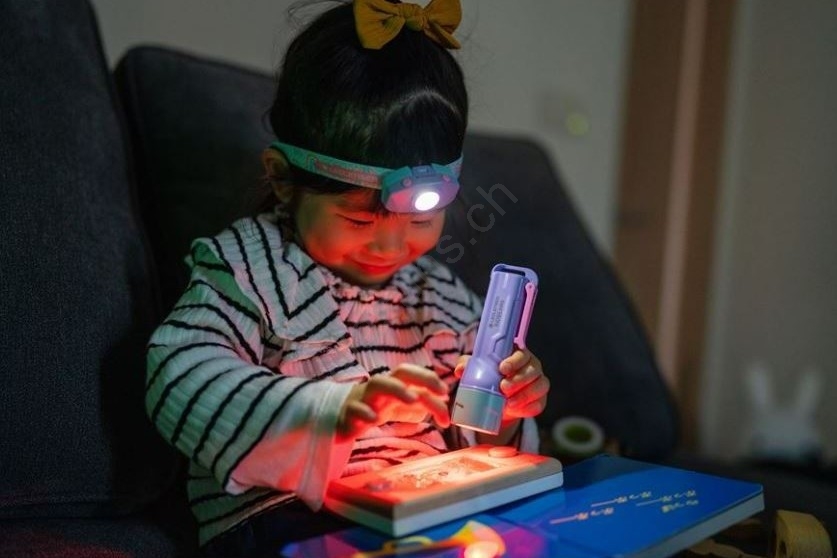 • Die Taschenlampe verfügt über vier Lichtfarben – Weiß, Rot, Grün und Blau – sowie eine Blinkfunktion, die die Sicherheit erhöht und den Spielspaß steigert.