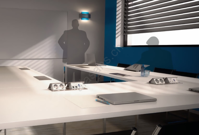 • Eingebaute Steckdosenbox für die Tischplatte.